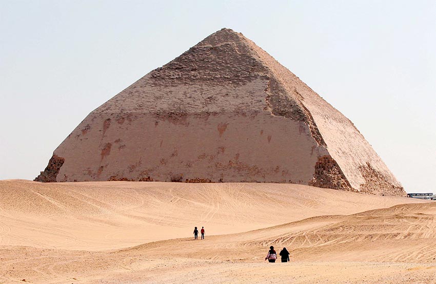 La première des pyramides de Dahschur fut la pyramide rhomboïdale, construite sous le règne du roi Snéfrou, père du célèbre pharaon Khéops. Elle fut la première tentative de construction d'une pyramide lisse, mais s'avéra être un échec en raison des mauvais calculs effectués sur le poids structurel placé sur le sol mou qui avait tendance à s’affaisser. Elle conserve encore la majeure partie de son revêtement, faisant de cette pyramide la mieux conservée de toute l’Égypte.