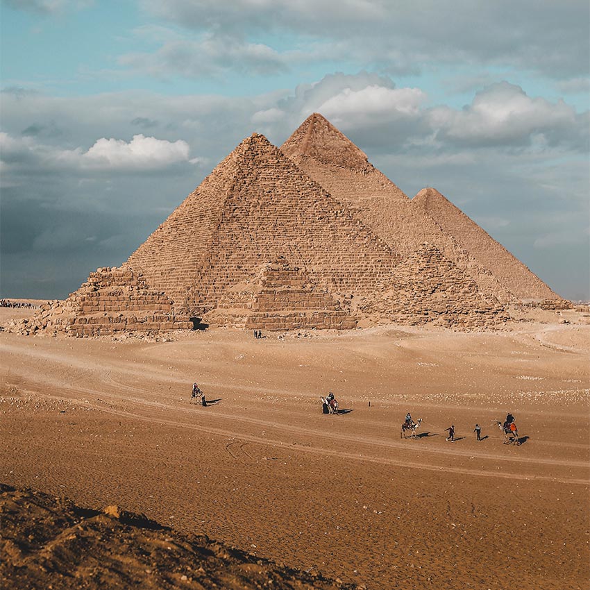 Ces pyramides laissent un souvenir impérissable et le Sphinx en sera le gardien. Le plateau de Gizeh est mondialement connu pour ses trois grandes pyramides, nécropoles des pharaons Khéops, Khéphren et Mykérinos.
